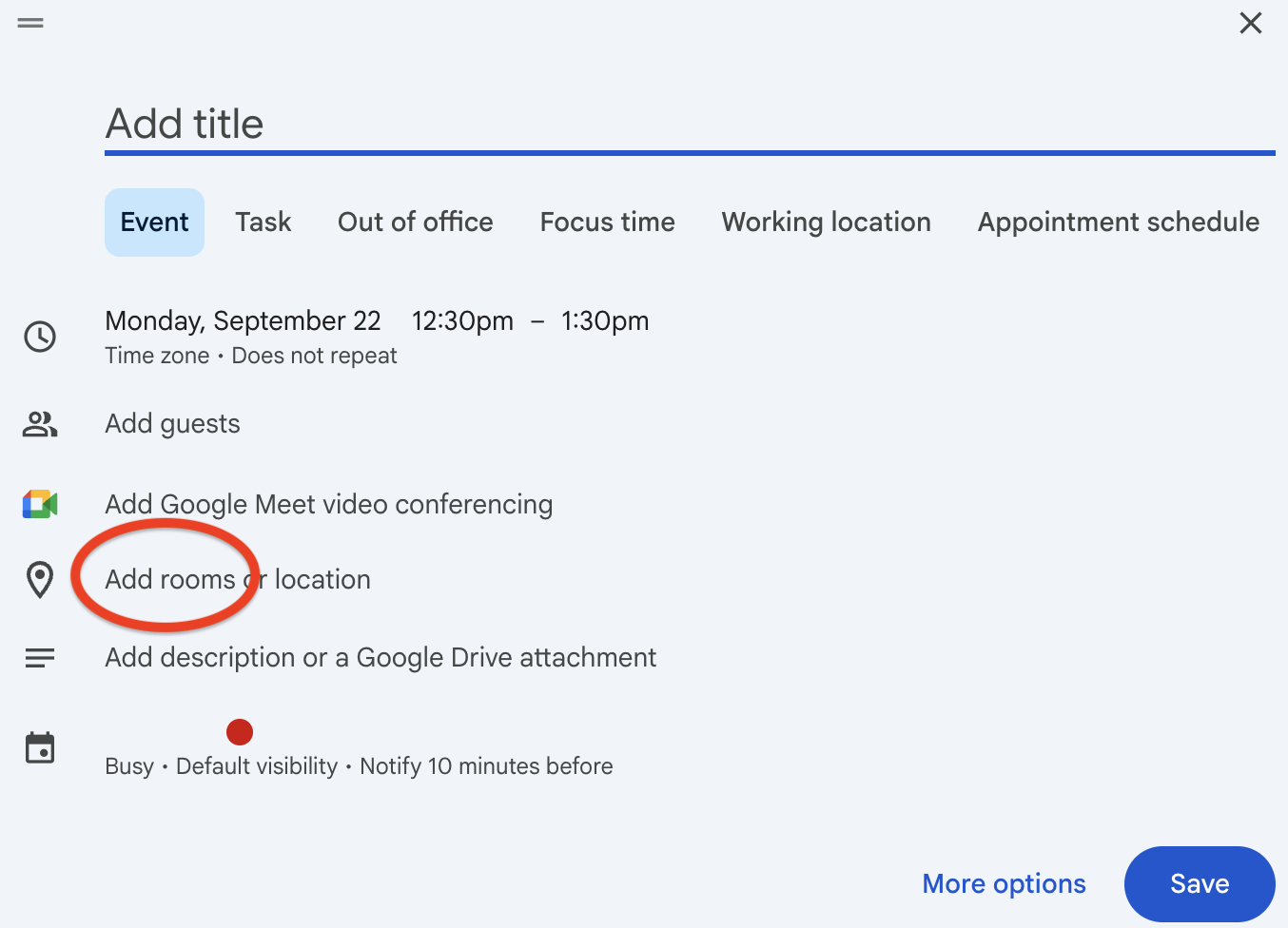 To schedule a space, search for the desired room using Google Calendar via the following steps:
